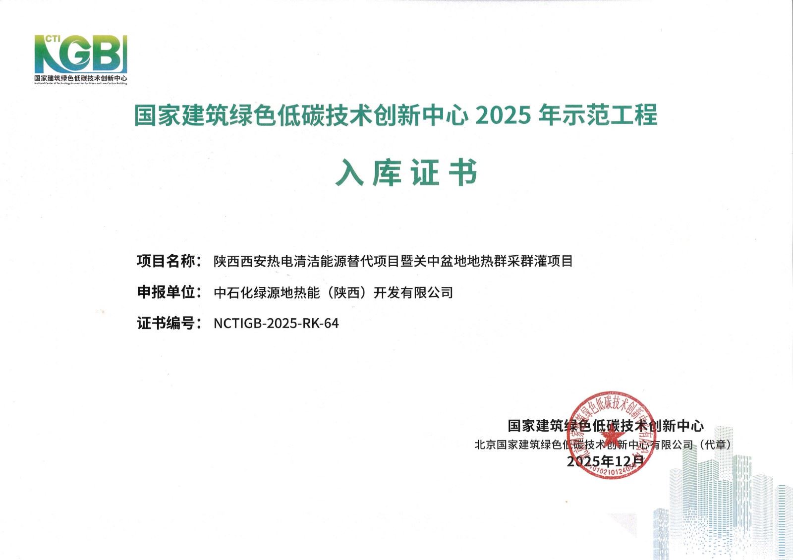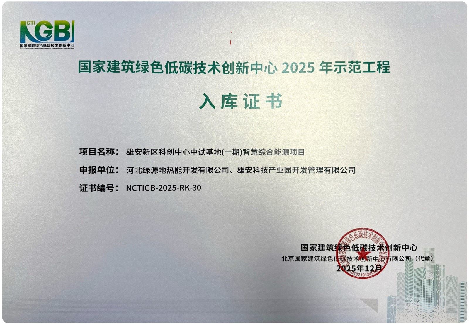 12月29日,国家建筑绿色低碳技术创新中心《建筑零碳设计》新书联合发布与示范工程技术交流会在北京召开,绿源公司雄安新区科创中心中试基地(一期)智慧综合能源项目和陕西西安热电清洁能源替代项目暨关中盆地地热群采群灌项目入库国家建筑绿色低碳技术创新中心2025年示范项目。